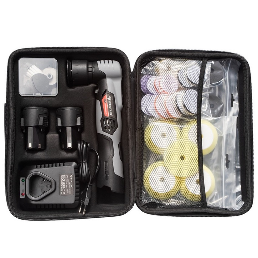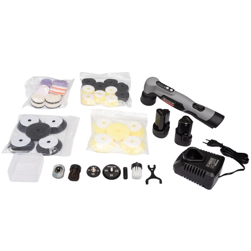 • Акумулаторен мини комплект за полиране STATUS CXP12-50LI, 12V, Ø38/50 мм, с 2 батерии, регулируеми обороти и богат набор аксесоари за фино полиране