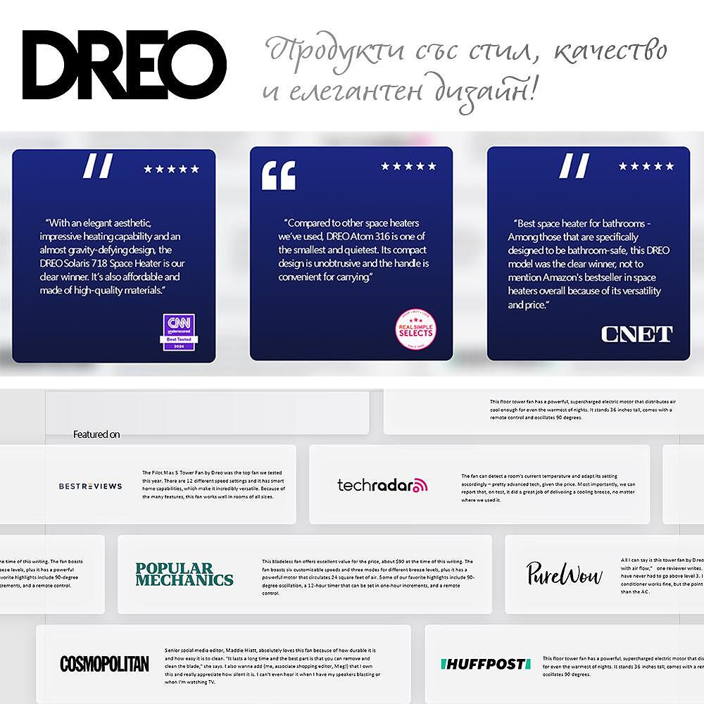- Освен качество и надеждност, вентилаторните печки DREO са изключително стилни и елегантни, така че да допълнят интериора на дома Ви и да внесат топлина в студените дни